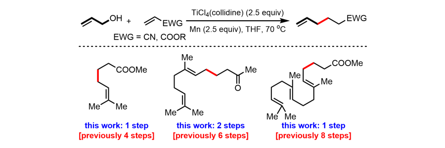 Liangcai Yao, Jiajing Bao, Yun Wang, and Jinghan Gui,* Titanium-Mediated Dehydroxylative Cross-Coupling of Allylic Alcohols with Electron-Deficient Olefins.