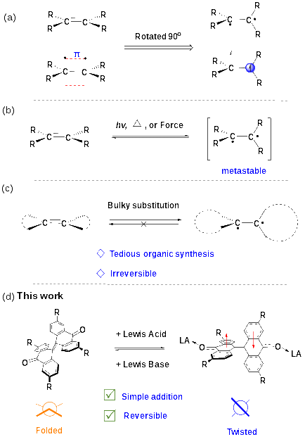 中国科学院上海有机化学研究所王新平研究员在碳碳双键结构调控领域取得新进展。研究团队基于其长期发展的路易斯酸耦合电子转移(LACET)策略(J. Am. Chem. Soc.2022, 144, 7978; CCS Chem.2023, 5, 334; Angew. Chem. Int. Ed. 2023, e202300068; J. Am. Chem. Soc.2023, 145, 17292; J. Am. Chem. Soc.2023, 145, 21733;Angew. Chem. Int. Ed.2024, 63, e202400913; Angew. Chem. Int. Ed.2024, e202411180; Nat. Commun.2024, 15, 7943),首次在无需外部刺激(光、热、压力等)条件下,实现了碳碳双键与稳定双自由基物种之间的高效、可逆转换。该方法通过路易斯酸与二蒽酮衍生物的配位,诱导碳碳双键发生超过70°的显著扭转,形成开壳层双自由基态,并可通过竞争性配体置换实现完全可逆的恢复。该研究为分子结构与电子态的动态调控提供了全新方法。