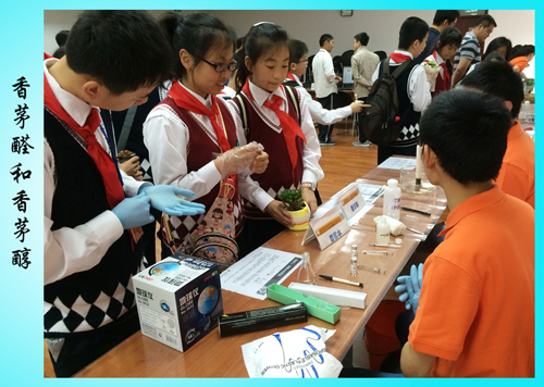 马大为课题组展示了合成“香茅醛”和“香茅醇”的实验。利用简单的化学反应,合成具有浓郁的甜玫瑰花的味道的物质,吸引了同学们来小试身手。