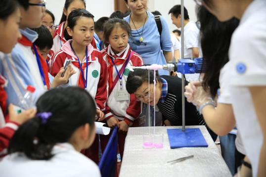 水中写字、五彩小蝌蚪、维C之奥秘和妙手执壶,操作简单,趣味十足。志愿者们在实验过程中通过直观显现的颜色变化说明了化学分子之间的作用,同时也透过这些现象变化向小朋友们科普了一些基本的化学知识。