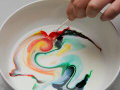康经武组给我们展示了“牛奶烟花”实验。该实验原理很简单,由于牛奶中含有油脂,它会在牛奶的表面形成一层油膜。洗洁精中正好有一种可以打破这层油膜的成分,当洗洁精滴入牛奶时油膜被破坏。油膜上的色素也就随着被破坏的油膜四散开来。便形成了我们所看到的牛奶烟花。