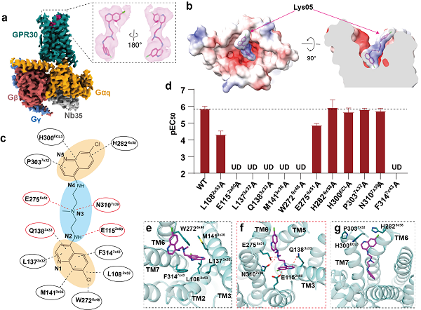 图2,a-b,Lys05-GPR30-Gq复合物的冷冻电镜结构(a)和原子模型(b);c,Lys05与GPR30相互作用的分子机制模式图;d,功能试验验证关键氨基酸突变对Lys05激活GPR30的影响;e-g,Lys05与GPR30配体结合口袋的氨基酸的相互作用。