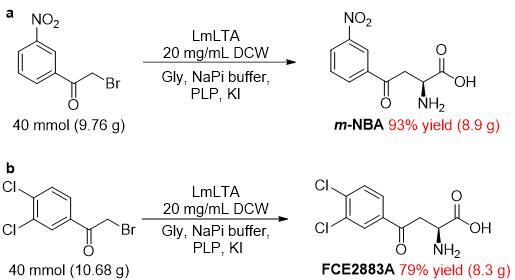 该研究首次报道了重新利用L-苏氨酸醛缩酶来催化SN2反应。这一全新催化活性利用易得的卤代α-羰基化合物,实现甘氨酸分子中sp³杂化Cα–H的不对称烷基化反应。通过机理研究与理论计算分析,该研究阐明了酶的活性位点如何精确调控底物的空间构型,使其有利于形成SN2反应过渡态。同时该研究进一步开发了碘化物辅助的Finkelstein反应策略,显著提升反应的转化效率。该研究开发的生物催化平台为高效制备种类繁多的、具有高对映体纯度的非天然α-氨基酸(29种实例)提供了途径,最高收率可达95%,并实现了卓越的立体控制(e.r. > 99:1)。最终利用全细胞催化实现KMO抑制剂m-NBA和FCE2883A等生物活性分子的10克级高效制备。这一发现不仅拓展了醛缩酶的催化功能范围,更突显了醛缩酶催化的非天然反应在不对称合成中的应用潜力。