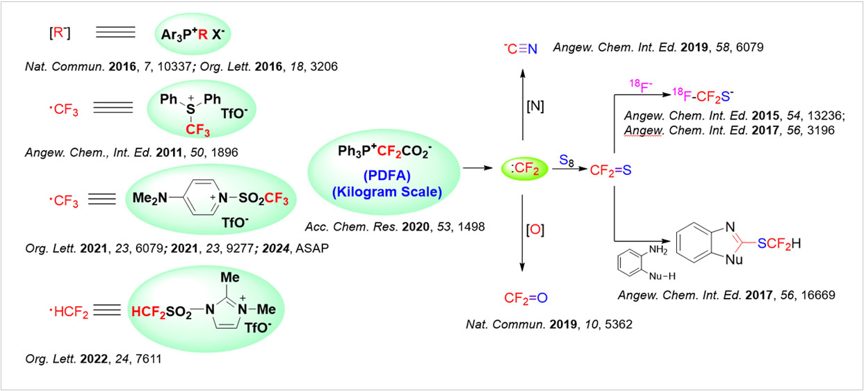 发展含氟新试剂并以此发现氟化学新规律是本课题组重要研究方向之一。以Ph3P+CF2CO2-为二氟卡宾试剂,实现了一些有趣的氟化学反应,如18F-标记的三氟甲硫基化:该试剂可简便地公斤级制备,已被国内外不同研究小组广泛使用;也发展了一些其它含氟新试剂,合成简单、使用方便。