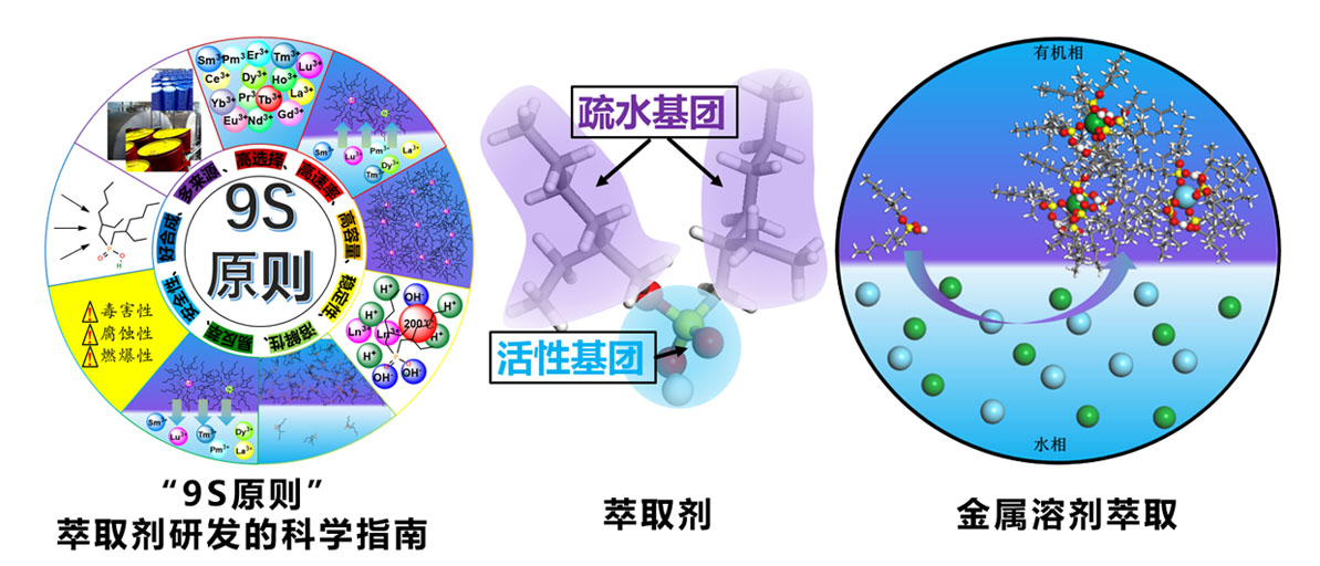 发展绿色高效金属萃取剂,中国科学院上海有机化学研究所以及本课题组耕耘多年,发展了P507、P227、P113、CA-12、P350、N1923等多种国内外广泛应用的金属萃取剂。在新时期,聚售新能源战略关键金属等领域中盐湖提锂、钴镍分离、稀土分离,提出了"9S原则”作为发展萃取剂的指导思想,受到国内外同行认可。