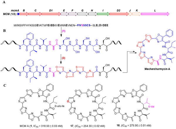图 (A)mcm基因簇;(B)MCM-A生物合成起始的两步转化;(C)MCM-A与组合生物合成产物17/18的结构及细胞毒活性