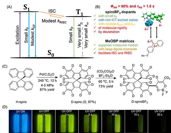 图 构筑高余辉量子产率且长余辉寿命的双组分有机室温余辉材料:(A)光物理过程;(B)发光分子设计和基体选择;(C)氘代spiroBF2的合成;(D)双组分材料的室温余辉观察