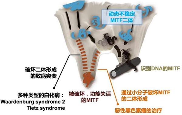 MITF的功能发挥依赖于其二体“亮氨酸拉链”的形成。通过对MITF功能缺失导致的白化病突变进行分析,研究团队发现该二体具有独特的动态不稳定性且对内外干扰非常敏感,并由此提出了小分子破坏MITF二体形成来特异抑制MITF的靶向机制。基于上述机制,团队进一步发现了小分子化合物TT012,在生化和细胞水平高效破坏MITF的二体形成,在全基因组水平特异抑制MITF转录活性,在多种动物模型中对MITF高表达的肿瘤表现良好肿瘤抑制活性。综上,团队首次研发了具有明确靶向机理,高效特异的MITF小分子抑制剂,为恶性黑色素瘤治疗提供全新的潜在靶向新药。该项工作在