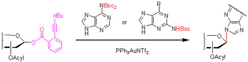 其中的一个优势是对于核苷的合成。核苷在生命过程中起关键作用,大量人工合成的核苷类化合物则通过干涉这些作用而成为重要的药物。糖与碱基的N-糖苷化是核苷全合成的关键;然而,迄今仍主要依赖经典的Vorbruggen反应,即糖基乙酰酯和预先硅烷化的碱基在Lewis酸的促进下进行的N-糖苷化反应。该反应条件较剧烈,产率可能不高,特别是与嘌呤类碱基反应时产率较低,而且,难以控制N9/N7的区域选择性。由于新反应中给体稳定、活化条件温和、没有引入亲核物种,因此,可以用酸敏感的叔丁氧羰基(Boc)这样的保护基来保护的嘌呤类碱基作为反应受体来进行N-糖苷化反应。这样,不仅克服了嘌呤在常规溶剂中的溶解性差的问题,而且完全控制了反应的区域选择性。这一合成核苷的新方法可望用于大量核苷类化合物的合成(Angew. Chem. Int. Ed.,2011, 50, 4933-4936)。