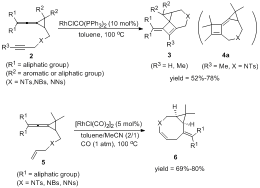 2011年进一步发现亚乙烯基环丙烷可以和炔烃在一价金属Rh催化下发生如下图所示的分子内串联环化反应得到多环和大环化合物(图4),工作发表在Angew. Chem. Int. Ed. 2011, 12027-12031.