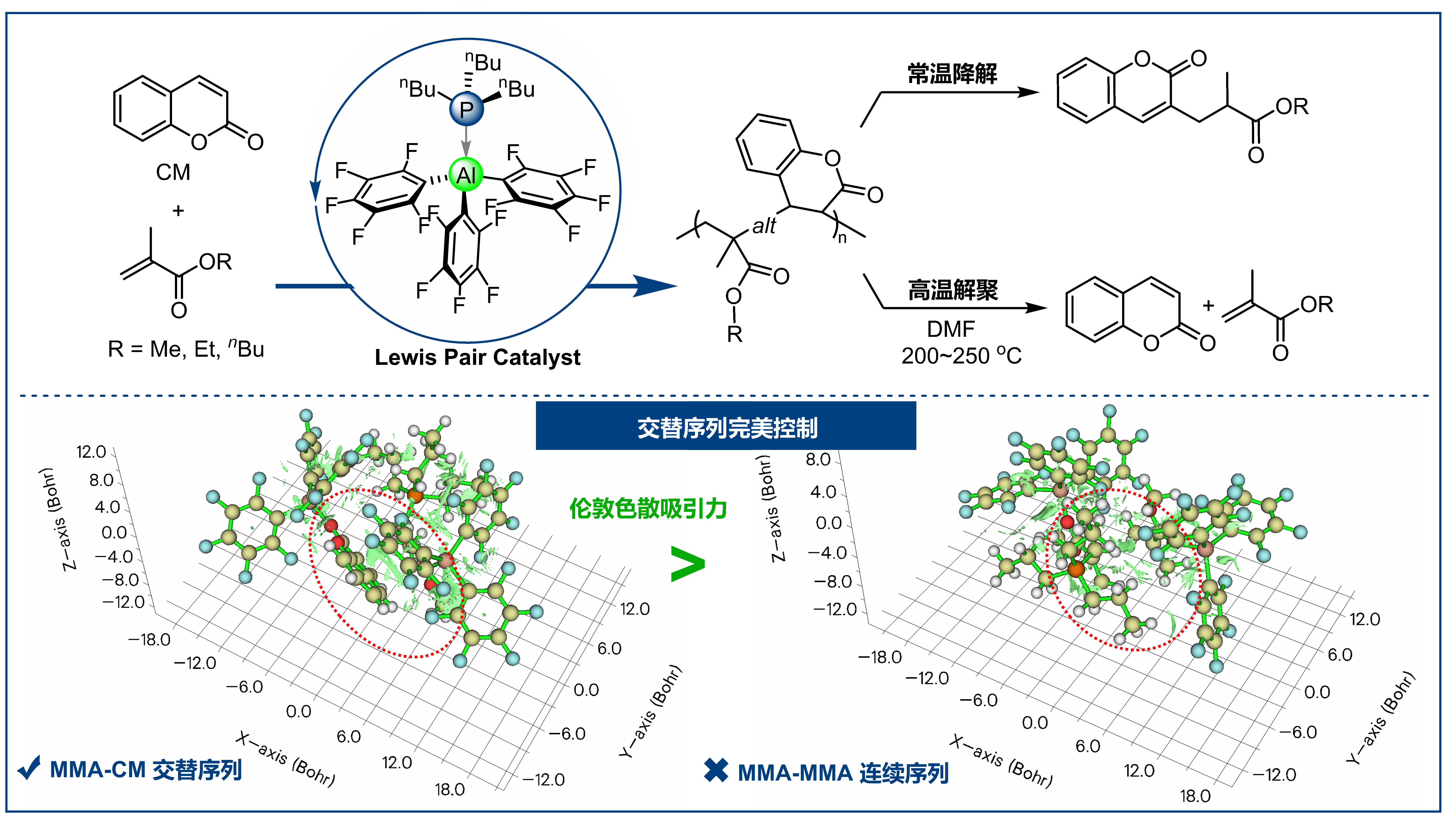 最近,本课题组进一步拓展了ACBC的应用,通过发展Al(C6F5)3/PnBu3路易斯酸碱新催化剂,实现了甲基丙烯酸酯与CM的高效活性共聚,由于甲基丙烯酸酯的位阻比丙烯酸酯大,故需使用超强路易斯酸Al(C6F5)3与小位阻PnBu3,以保障单体的活化与高效引发。所得聚合物具有完美的交替序列控制,不受甲基丙烯酸酯结构及投料比的影响,这与丙烯酸酯共聚体系显著不同(其需过量CM才可实现高但不完美的交替度)。理论计算表明:与丙烯酸酯共聚体系的热力学控制不同的是,该体系为动力学控制(图1),生成MMA-CM交替序列的能垒远低于MMA-MMA连续序列(MMA: 甲基丙烯酸甲酯),该反常的动力学优势源自于催化剂与CM之间的伦敦色散吸引力高于MMA;这种通过催化剂控制交替序列的机制与文献中单体电子给/受体调控策略完全不同,为乙烯基单体的交替序列控制提供了新方法。受益于交替序列控制,合成得到的高透明、高耐热性C-C主链聚合物(Tg: 130-190 °C, Td up to 300 °C)亦可通过ACBC实现常温定量降解,并可在强给电子溶剂(如DMF)存在下,实现高温定量解聚,进而回收单体。在可降解/解聚的同时,这种C-C主链聚合物还兼具优异的耐久性,常温储存6个月、紫外照射24小时、高温高湿100小时(80 °C,50%湿度)均保持稳定,突破了以往可持续性高分子材料通常面临“可降解/解聚性”与“耐久性”无法兼顾的挑战。