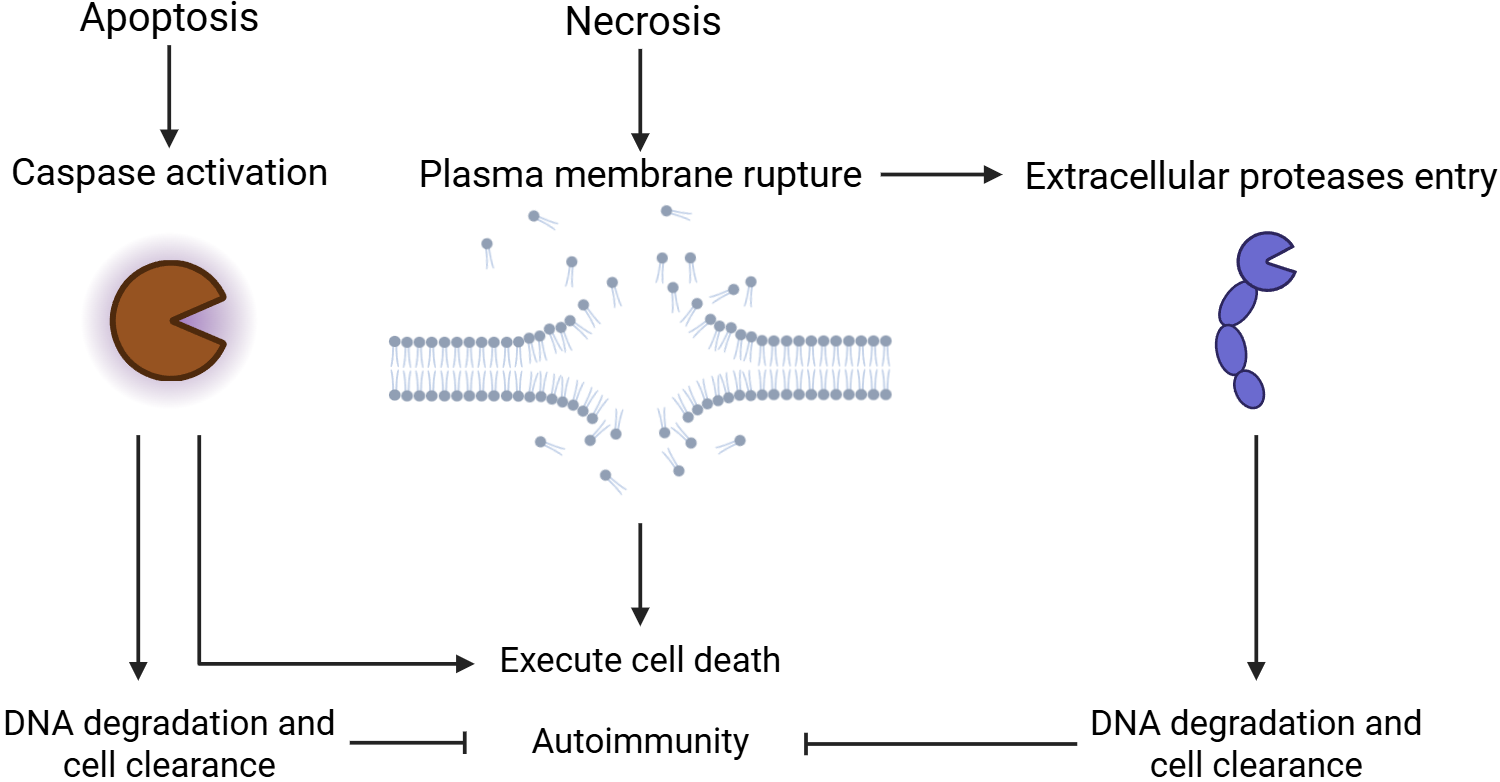 细胞凋亡的发生由caspase家族主导,其特点是细胞膜保持完整,内容物不泄露。凋亡细胞中caspase的激活不仅执行了细胞死亡,同时通过调节磷脂酰丝氨酸(PS)外翻、膜出泡和凋亡小体形成、基因组DNA降解等过程,保证了凋亡细胞的清除与降解。而坏死则以细胞膜完整性丧失为特征,但目前我们仍不清楚坏死细胞具体是如何实现细胞清除的。