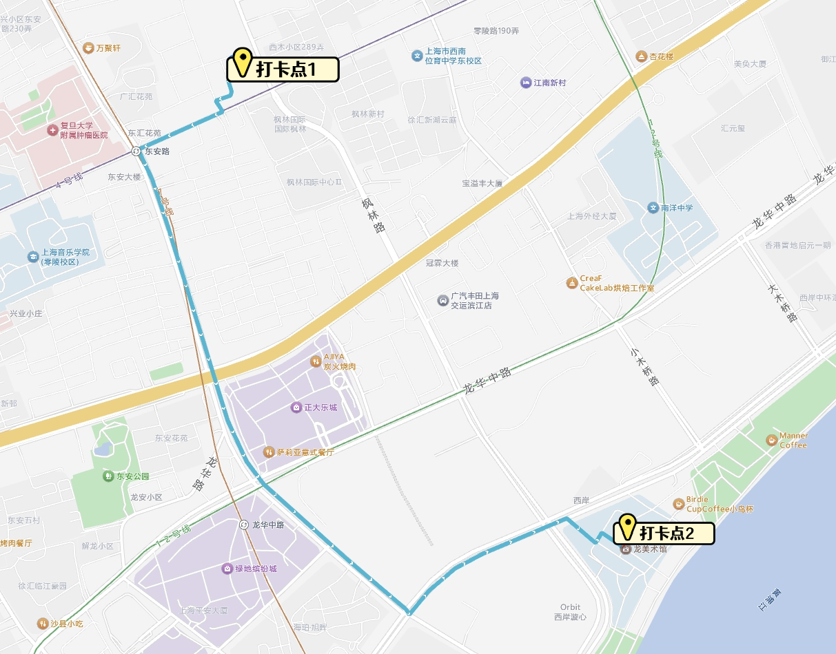 健步走的建议路线如图所示,2号打卡处设在滨江龙美术馆附近。