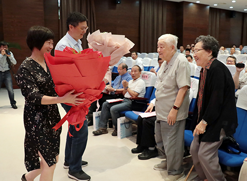 瞿荣辉和所党委副书记刘菲分别代表上海分院和有机所向陆熙炎伉俪献花;副所长唐勇院士代表有机所向陆先生赠送了《陆熙炎院士九十华诞志庆集》及《但求深精新——陆熙炎传》,恭贺先生90华诞。