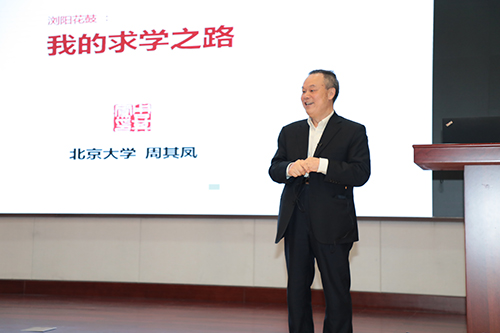 周其凤在报告中以一段自编的浏阳花鼓戏顺口溜开篇,“其中滋味难解,自古知音难觅”,三言两句道出了人生哲理。他援引孔子《论语·子罕》中“吾少也贱,故多能鄙事。君子多乎哉,不多也”,回顾了自己少年时代的逸闻趣事,缅怀了母子间的深厚感情,追忆了求学之路的不易。家境的贫苦,曾让他一度面临辍学;恩师的救助,终得以提名北大,勉励大家贫穷也不一定是坏事,要懂得尊重,感恩命运。此外,还分享了自己在科研道路上的经历与感悟,阐述了其提出的“甲壳型液晶高分子”概念及研究进展,通过个人经历告诉大家在科研中没有那么多的“合适”和“理想”,面对不称心和不如意,要懂得适应环境、创造条件、坚守兴趣、筑牢基础,人生亦是如此。周其凤期望大家能够“节廉自重”,以“成人之美”待人,所谓“各美其美,美人之美,美美与共,天下大同”。“非学无以广才,非志无以成学”的主旨思想贯穿了整场报告,深入启发了大家对学习生活、科研工作、乃至未来发展的思考。报告会现场气氛热烈,多次爆发出经久不息地掌声。