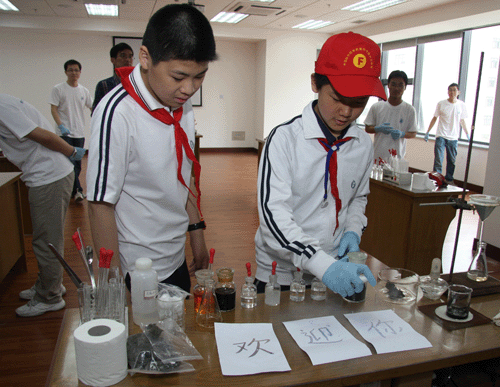 科普专题讲座结束后,来访者在志愿者的引导下分批分别参观了金属有机化学国家重点实验室、生命有机化学国家重点实验室、中国科学院天然产物有机化学重点实验室、中国科学院有机氟化学重点实验室和上海有机所高分子材料研究室集中展示厅。各展厅通过视频、幻灯片、展板、趣味化学实验等多种形式向公众展示了各研究室所涉及的领域及化学与人类生活之间千丝万缕的联系。由各研究室研究员、职工和研究生组成的志愿者们通过耐心讲解和示范,生动地揭示了化学世界的奥妙,来访者兴趣盎然、热情高涨,化学反应过程中产生的颜色和物质形态的变化唤起了大家强烈的兴趣和好奇心。许多同学迫切地想要走进奇妙的化学世界,兴致勃勃地自己动手操作起小实验,体会其中的乐趣所在。