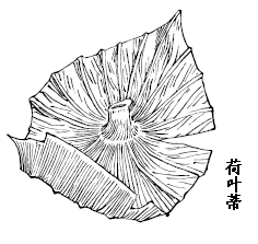 本品为荷叶中央近叶柄外剪下的叶片,近圆形、半圆形或菱形,直径6-7cm。上面紫褐色或绿黄色,较粗糙,叶脉微凹,作辐射状散出,下面棕黄色,有光泽,中央有残存叶柄基,叶脉突起。质轻面松脆。气微,味涩。 | |