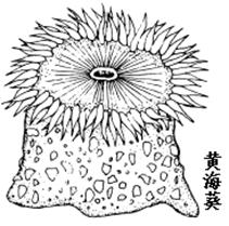 黄海葵为海葵科动物黄海葵的全体。 黄海葵体态多变,伸展时呈圆筒形;收缩时呈左右对称的相合状,体高30-90mm,体宽30-70mm,多数为中等大小。体的顶端为口盘,其上有放射条纹和环纹构成的图案,口盘底色为深浅不一的灰白色和青褐色。口位于口盘中央,呈裂缝状,周围有浅粉红色的口唇。口盘边缘环生数圈触手,触手细长可伸缩,呈浅褐色,有的为粉红色,排列整齐,按12的倍数排列,总数为96根,长度约等于口盘直径,各触手长度略相等。触手向口面有白斑;反口面的基部有灰白色结节约20个。体色变异较大,上部为灰褐色或灰绿色,下部为黄褐色或肉色。体壁上有疣状吸盘,上部比下部多,下部近平滑,吸盘上常吸有小沙或碎壳。体常埋于沙中,下端有圆形足盘,固着于沿海高潮线岩石上或残水坑沙中石上。当退潮时,触手伸展如菊花状,若遇惊动即缩于泥沙中。为极普通的种类。我国分布于黄海、渤海、东海。