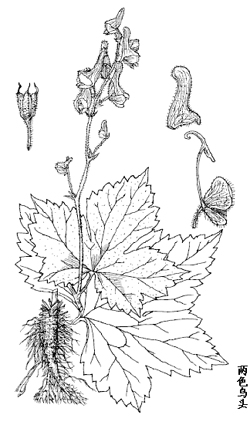 两色乌头为毛莨科植物两色乌头的根。 两色乌头是多年生草本。根圆柱形, 长10-15cm。茎缠绕,长1-2.5m,疏被反曲的短柔毛。叶互生;基生叶和茎下部叶具长柄,柄长达20cm;叶片五角状肾形,长6.5-12cm,宽9.5-22cm,基部心形,3深裂至近中部,中央深裂片菱形,侧深裂片不等2浅裂,浅裂片上部不明显3浅裂,边缘具粗牙齿,两面疏被短伏毛。总状花序,长6-14cm,具花3-8朵;花序轴及花梗密被伸展的短柔毛;苞片线形,长3-3.5mm;花梗长5-9mm;小苞片生花梗的基部或中部;两性花,两侧对称;萼片5,花瓣状,上萼片圆筒形,长1.3-2cm,喙短,稍向下弯,下缘长1-1.3cm,淡紫色,被伸展的柔毛;花瓣2,与上萼片近等长,距细,比唇长,拳卷,无毛;雄蕊多数,花丝全缘,无毛;心皮3,被毛或无毛。蓇葖果,长约1.2cm。种子多数,倒圆锥状三角形,长约2.5mm,生横狭翅。花期8-9月,果期9-10月。 |