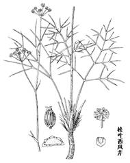 2.松叶西风芹与竹叶西风芹的区别为:叶片为二至四回三出式全裂,末回裂片狭线形,极少为线状披针形,长0.7-6.5cm,宽达3mm。 3.多毛西风芹与前2种的区别为:叶片3全裂,不成羽状分裂,裂片线状披针形,长7-13cm,宽5-10mm;主脉突起,两面有白色短硬毛,以背面边缘及脉上较多;茎上叶细小,线状披针形。花序梗有毛;总苞片和小总苞片均5-7,密被白色粗毛;花瓣外面有白色柔毛。分生果卵状近球形,果柄密被白色粗毛;每棱槽内油管1,合生面油管2。 |
