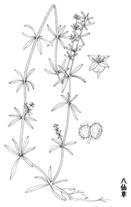 八仙草为茜草科植物猪殃殃或粗叶拉拉藤的全草。 1.猪殃殃是一年生蔓生或攀援草本,长20-40cm。茎绿色,多分枝,具四棱,沿棱生有倒生刺毛。叶4-8片轮生;近无柄;叶片线状披针形至椭圆状披针形,长2-4cm,宽2-6mm,先端有凸尖头,1脉,上面绿色,被倒白刺毛,下面淡绿色,沿中脉及边缘被毛。聚伞花序腋生或顶生,具数朵花;花小,黄绿色;花萼截头状,长约7mm,被钩毛;花冠4裂,裂片长圆形;雄蕊4,伸出;子房下位,2室,花柱2裂。果实干燥,通常由2个(偶或1个)近球形的果爿组成,表面密生钩刺;每果爿内有一平凸的种子。花期4-5月,果期6-8月。生于路边、荒野、田埂边及草地上。分布于全国大部分地区。
