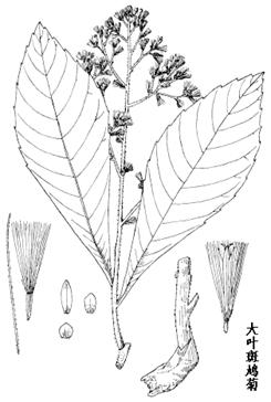 大叶斑鸠菊是灌木或小乔木,高5-8m。枝粗壮,圆柱形,被淡黄褐色绒毛。叶互生;叶柄短宽,长10-18mm,基部常扩大而成鞘状,密被绒毛;叶大,倒卵形、倒卵状长圆形或披针形,长15-40cm,宽4-15cm,先端急尖或钝尖,基部渐窄成宽楔形,边缘深波状或具疏粗齿,稀近全缘,侧脉12-17对,细脉网状,叶脉在下面突起,上面无毛或仅中脉被疏柔毛,下面沿脉被柔毛,具腺点。头状花序多数,在枝端排成长达20cm以上无叶的大复圆锥花序,下部分枝的圆锥花序长8-10cm,花序轴被黄绒色密绒毛,无梗或有短梗;总苞钟状,直径5-8mm;总苞片约5层,覆瓦状,淡褐色或上端紫色,卵状披针形,外层短钝,内层稍尖,外面有密柔毛和睫毛;花托平,具窝孔;花淡红色或淡红紫色,花冠管状,长7-8mm,管部短,檐部狭钟形,无毛。瘦果圆柱形,长约4mm,具8-10纵肋,肋间具腺或多少被微毛;冠毛白色,外层短,内层糙毛状,长8-9mm。花期10月至翌年4月。 |