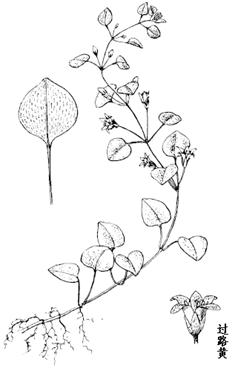 过路黄是多年生蔓生草本。茎柔弱,平卧延伸,长20-60cm,表面灰绿色或带红紫色,全株无毛或被疏毛,幼嫩部分密被褐色无柄腺体,下部节间较短,常发出不定根,中部节间长1.5-5(-10)cm。叶对生;叶柄长1-3cm,无毛;叶片卵圆形、近圆形以至肾圆形,长(1.5-)2-6(-8)cm,宽1-4(-6)cm,先端锐尖或圆钝以至圆形,基部截形至浅心形,稍肉质,透光可见密布的透明腺条,干时腺条变黑色,两面无毛,有腺毛。花单生于叶腋;花梗长1-5cm,通常不超过叶长,花梗幼嫩时稍有毛,多少具褐色无柄腺体;花萼长(4-)5-7(-10)mm,5深裂,分裂近达基部,裂片披针形,椭圆状披针形以至线形或上部稍扩大而近匙形,先端锐尖或稍钝,无毛、被柔毛或仅边缘具缘毛。花冠黄色,辐状钟形,长7-15mm,5深裂,基部合生部分长2-4mm,裂片狭卵形以至近披针形,先端锐尖或钝,具黑色长腺条;雄蕊5,花丝长6-8mm,下半部合生成筒,花药卵圆形,长1-1.5mm;子房卵球形,花柱长6-8mm。蒴果球形,直径3-5mm,无毛,有稀疏黑色腺条,瓣裂。花期5-7月,果期7-10月。 |