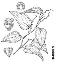 四川轮环藤是草质藤本,有时老茎稍变木质,除苞片外全株无毛。茎纤细而长,具纵条纹。叶柄在叶片近基部盾状着生;叶薄革质或纸质,披针形或长卵形,长5-15cm,宽2-5.5cm,先端渐尖或尾状渐尖,基部圆形,全缘,干时变褐色,掌状脉3-5条。花序腋生,总状花序式,有时为穗状花序式,长可达20cm;雄花序较纤弱;雄花萼片4,仅基部合生,椭圆形或卵状长圆形,长约2.5mm;花瓣4,分离或合生,聚药雄蕊有4个花药;雌花萼片2,花瓣2,微小,贴生于萼片基部。核果红色,内果皮长约7mm,背部两侧各有3行小疣状雕纹。 |
