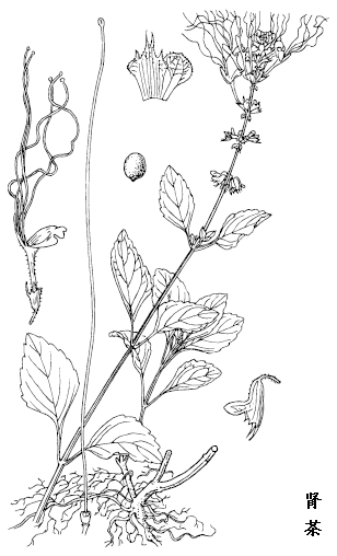 肾茶是多年生草本,高1-1.5m。茎直立,四棱形,被倒向短柔毛。叶对生;叶柄长0.4-3cm,被短柔毛;叶片卵形、菱状卵形或卵状椭圆形,长2-8.5cm,宽1-5cm,先端渐尖,基部宽楔形或下延至叶柄,边缘在基部以上具粗牙齿或疏圆齿,齿端具小突尖,两面被短柔毛及腺点。轮伞花序具6朵花,在主茎和侧枝顶端组成间断的总状花序,长8-12cm;苞片圆卵形,长约3-5mm,先端骤尖,下面密被短柔毛,边缘具缘毛;花萼钟形,长5-6mm,外面被微柔毛及腺点,花后增大,上唇大,圆形,下唇具4齿,齿三角形,先端具芒尖,正中2齿比侧2齿长1倍,边缘均具短缘毛;花冠浅紫色或白色,外面被微柔毛,上唇具腺点,花冠筒极狭,长9-19mm,直径约1mm,上唇大,外反,3裂,中裂片较大,先端微缺,下唇直伸,长圆形,微凹;雄蕊4,极度超出花冠筒外2-4cm,前对略长,花药小;子房4裂,花柱长长地伸出,柱头2浅裂;花盘前方呈指状膨大。小坚果卵形,深褐色,具皱纹。花期5-11月,果期6-12月。 |