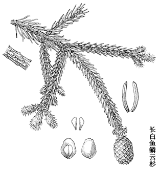 长白鱼鳞云杉属乔木,高20~40m,胸围达1m。树皮灰色,裂成鳞状块片。一年生枝黄色、淡黄色或黄褐色,微有光泽;冬芽圆锥形或卵状圆锥形,芽鳞排列疏松,小枝有木钉状叶枕。叶条形,直或微弯曲,长1~2cm,宽12~18mm,先端微钝,上面有2条淡白色气孔带,下面光绿色,无气孔带。球花单性,雌雄同株,球果单生枝顶,下垂,卵圆形或卵状椭圆形,熟时淡褐色或褐色,长3~4cm,径2~22cm;种鳞薄排列疏松,中部种鳞菱状卵形,先端圆,边缘有不规则的小缺齿;苞鳞卵状矩圆形,长约3mm,先端有短尖头或圆。种子近倒卵圆形,连翅长7~85mm。花期4~5月,球果9~10月成熟。