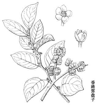 香港算盘子属灌木或小乔木,高1-5m。小枝无毛。单叶互生;叶柄长3-6mm;托叶三角形,长2-3mm;叶片革质,卵形至长圆状卵形,稀长圆形或椭圆形,长5-15cm,宽3-6cm,先端钝或圆形,两侧稍偏斜,基部截形,微心形或浑圆,干时上面淡绿色,下面紫赤色;侧脉5-7对。花通常雌雄同株,排成短小的聚伞花序,或簇生成花束,腋生或腋外生;雌花及雄花常分别生于小枝的上下部,或雌花序内具1-3朵雄花;雄花花梗纤细,长6-9mm,有时可达11mm,萼片6,卵形至阔卵形,两面均无毛,雄蕊5-8,花丝合生;雌花花梗稍粗短,长3-9mm,萼片6,阔卵形,通常较雄花为短,子房幼时被极短柔毛或无毛,5-6室,花柱合生呈圆锥状,先端近截平。蒴果扁球形,先端稍凹下,直径8-10mm,高约5mm,具5-6条不显著纵沟,无毛,种子扁,具3棱,深红色。花期4-7月,果期8-9月。 |
