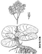 厚叶岩白菜为虎耳草科植物厚叶岩白菜的全草?它是多年生草本,高5~50cm,无毛?根茎粗,横走,棕褐色,有鳞片和枯残托叶鞘?茎直立,无叶或具1个小叶?叶基生;叶柄长3~9cm,基部具托叶鞘;叶片质厚,近革质,有光泽,圆形或宽椭圆形,长5~125cm,宽32~95cm,先端钝圆,基部通常楔形,稀浅心形,两面多具小腺窝,无毛,边缘具钝齿或不明显的细锯齿,叶脉明显?聚伞花序圆锥状顶生;长35~13cm,多花;花梗长2~4mm;花萼钟状,5裂,裂片圆形;花瓣5,倒卵形,长10~12mm,宽6~8mm,先端微凹,基部渐狭成爪,多脉,白色,或淡粉红色;雄蕊10;子房卵球形,半下位,花柱2,柱头头状?蒴果2裂?种子多数,平滑,长15~2mm?花期5~7月,果期9~10月?