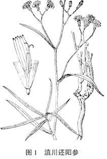 还阳参为菊科植物滇川还阳参、驴打滚儿草和长茎还阳参的全草或根。 1、滇川还阳参CrepisrigescensDiels是多年生草本,高20~40cm?根为圆柱形?茎直立,木质,不分枝或叉状分枝?叶无柄;茎基部叶小,鳞片状;中部叶条形,长6~10cm,宽3~4mm,全缘或有细齿,稍反卷,无毛或有短柔毛?头状花序小,均有12朵小花,排成疏圆锥花序,梗长0.5~3.5mm;总苞圆柱形至钟状,长8~9mm,宽2~2.5mm;外层总苞片6,条形或披针形,长为内层的1/2,内层总苞片8~12,披针形,近先端有密纤毛;舌状花橘黄色,长约12mm?瘦果纺锤形,近扁平,褐色,长3.5~4mm,有10~16条纵肋;冠毛淡黄白色,长约5mm?(如图1所示)生于高山坡开旷的石隙中?分布于四川及云南?
