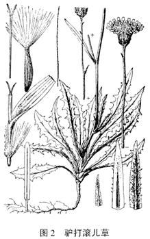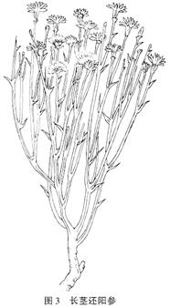 2、驴打滚儿草Crepiscrocea(Lamk.) Babc. [C. turczan-nowii C. A. Mey. ],又名:还羊参《中国高等植物图鉴》?它是多年生草本,高20~30cm?茎直立,不分枝或分枝?基生叶丛生,倒披针形,长4~8cm,宽0.8~2cm,急尖,边缘有波状齿,或倒齿状至羽状半裂,裂片全缘,基部渐狭成具短翅的叶柄,白色或苍白色带紫色;茎上部叶条形,渐尖,无柄;最上部叶小,苞叶状?头状花序较大,单生于枝端;总苞钟状,长11~14mm,宽4~9mm;外层总苞片8~13,长为内层总苞片的1/3~1/2,条状披针形,渐尖,有毛,内层总苞片披针形,先端钝,边缘膜质,有柔毛;舌状花黄色?瘦果纺锤形,暗紫色或黑色,长5~6mm,宽约1mm,有18条纵肋;冠毛白色,长7~8mm,如图2所示。该植物生于山坡?山谷或路旁?分布于东北?华北及西藏? 3、长茎还阳参Crepis elongate Babc. [Crepis tibetica Babc. ],又名:铁刷把?有根无叶《文山中草药》,西藏还阳参《西藏植物志》?该植物是多年生草本,高30~50cm?根圆柱形?茎直立,深绿色,有纵槽纹,分枝多?叶互生,退化成极小的刺状叶,长0.5~1cm,先端锐尖?头状花序顶生,花黄色?瘦果黑褐色,先端有白色冠毛?花期夏季,如图3所示。它生于山坡?田边?路旁草丛中?分布于广东?广西?云南?西藏等地?