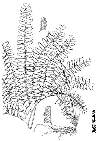 掌叶铁线蕨是多年生草本,高30-70cm。根茎短,横卧,被褐色膜质鳞片。叶簇生;叶柄黑紫色,光滑无毛,具光泽,先端分叉;叶片2叉分歧,呈掌状;羽片单生于主枝上侧,羽状分裂,中部的最大;小羽片斜长方形,基部楔形,上缘浅圆裂,无主脉。孢子囊群横长圆形,稍曲,着生于由叶缘反曲而成的膜质囊群盖下面;囊群盖肾形或矩圆形。 |