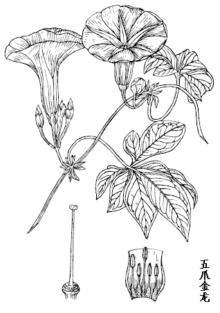 五爪金龙是多年生缠绕草本。全株无毛。老时具块根。茎细长,有细棱,有时有小疣状突起。叶互生;叶柄长2-8cm;基部具假托叶;叶片掌状5深裂或全裂,裂片卵状披针形、卵形或椭圆形,中裂片较大,长4-5cm,宽2-2.5cm,两侧裂片稍小,先端渐尖或稍钝,具小短尖头,基部楔形渐狭,全缘或不规则微波状,基部1对裂片通常再2裂。聚伞花序腋生,具1-3朵花,或偶有3朵以上;苞片及小苞片均鳞片状,早落;萼片5,稍不等长;花冠紫色或淡红色,偶有白色,漏斗状,长5-7cm;雄蕊5,不等长,花丝基部稍扩大,被毛;子房无毛,花柱纤细,长于雄蕊,柱头2球形。葫果近球形,2室,4瓣裂。种子黑色,边缘被褐色柔毛。花、果期夏、秋季。 |