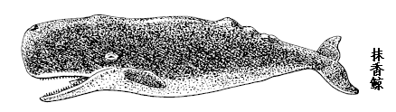 抹香鲸是齿鲸中最大的一种,一般雌性体长12-17m;雄体长达20-23m,重30000-40000kg。头大,箱形,可占体长的1/4-1/3,前端截形。吻向前突出于下颌1.5m。额部巨大,内有特殊脂肪体,或称鲸蜡器官。外鼻孔1个,位于头顶左侧前缘,俗称喷水孔。眼小,位于口角后上方。外耳孔极小。上颌具无功能性的痕迹齿;下颌狭窄,每侧具20-25枚圆锥形的功能齿。鳍肢短圆形,成年鲸的鳍肢长约1m。无背鳍,仅在体后1/3的背部有1列驼峰状突起。尾鳍近三角形,后缘有缺刻,宽可达4m以上。体背暗黑稍带红(宛如供佛的抹香颜色)及蓝灰色或瓦灰色,体侧略淡。口角处近淡白色,体最前端有旋涡状密布的白斑。皮肤裸露,有的于体侧及喉胸部具褶皱或浅沟。皮下脂肪厚。鳍肢及尾鳍全黑色。腹面银灰色或白色。 |