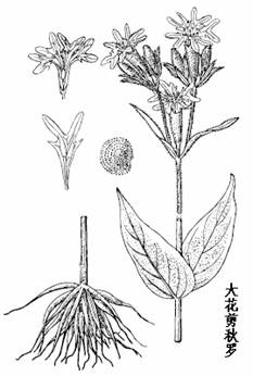 大花剪秋罗是多年生草本,高25-85cm。根呈肥厚的纺锤形。茎单生,直立,上部疏生长柔毛。单叶对生;叶长圆形或卵状长圆形,长3.5-10cm,宽约3.5cm,先端渐尖,基部圆形,两面均有硬柔毛。聚伞花序,有2-3朵花,叶腋短枝端常有单花;苞片钻形,密生长柔毛;花梗短,密生长柔毛;萼管棍棒形,有10条脉,密生长柔毛;花瓣5,深红色,基部有爪,边缘有长柔毛,瓣片4裂,中2裂片较大,外侧2裂片较小,喉部有2鳞片;雄蕊10;子房长圆状圆柱形,花柱5,丝形。蒴果5瓣裂,齿片反卷。种子小,暗褐色或黑色,表面有疣状突起。花期6-8月,果期7-9月。 生于海拔400-2000m的山林草甸、林间草地。分布于东北和华北。 |